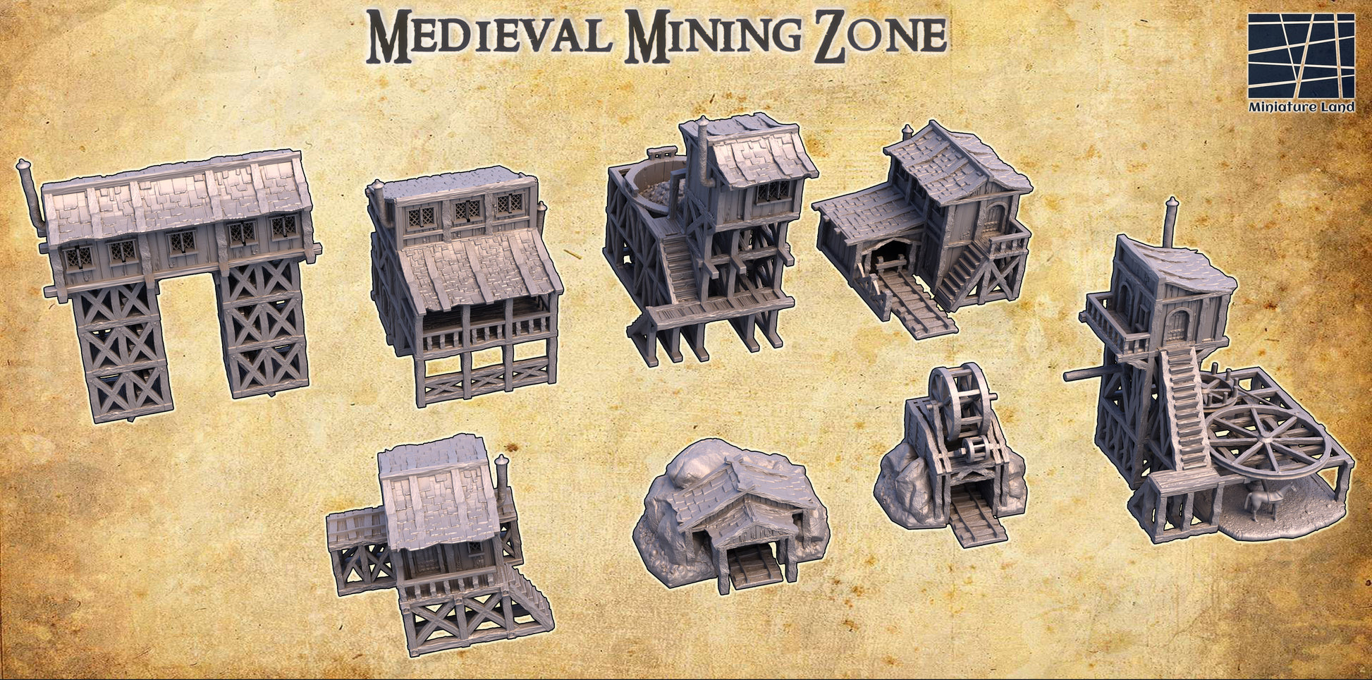 Bring your tabletop adventures to life with this highly detailed 3D Printed Medieval Mining Zone – a modular terrain set perfect for Dungeons & Dragons and other RPGs. This sprawling mining complex includes buildings, mine carts, tracks, scaffolding, ore piles, and industrial structures, all designed to create an immersive world for your players.