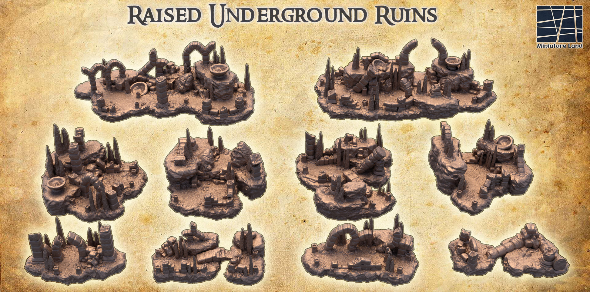 Transform your tabletop adventures with the Raised Underground Ruins, a stunning 3D printed set perfect for Dnd terrain, Warhammer 40k, Age of Sigmar, and 40k terrain enthusiasts. This collection of intricately made ruins includes rugged rock formations, broken arches, scattered columns, and elevated platforms, ideal for enhancing your Dnd accessories and Warhammer40k battles. Perfect as dungeon master gifts, these detailed pieces feature jagged spires, crumbled walls, and natural cave-like structures, adding depth to your Warhammer terrain and 40k gaming sessions. Crafted with precision using 3D printing technology, this terrain set brings an authentic underground aesthetic to your Dnd or Warhammer 40k campaigns.